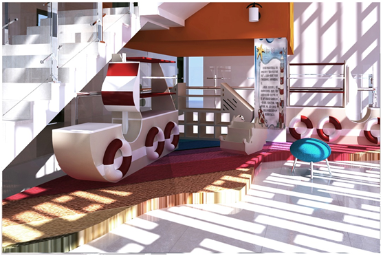 原来楼梯的采光不是很好,且比较窄,根据这个,设计师采用了颜色比较亮的墙砖,通过光线的反射,不仅扩大了视觉效果,也提高了整个楼梯的亮度;正对着楼梯的墙面采用智慧树的创意,可以悬挂学生的优秀作品;同时,树枝统一伸向一个方向,也表明了空间向这个方向还有延伸。