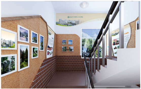这个楼梯墙面以展示为主,下部采用暗红色的墙砖,上部大面积使用软木,用来展示学生作品,教师风采等等,外表美观、使用方便。