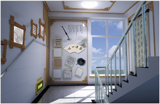 书法主题楼梯。采用原木色的画框,悬挂书法作品,让学生在楼梯间也能感受到书法艺术的魅力。