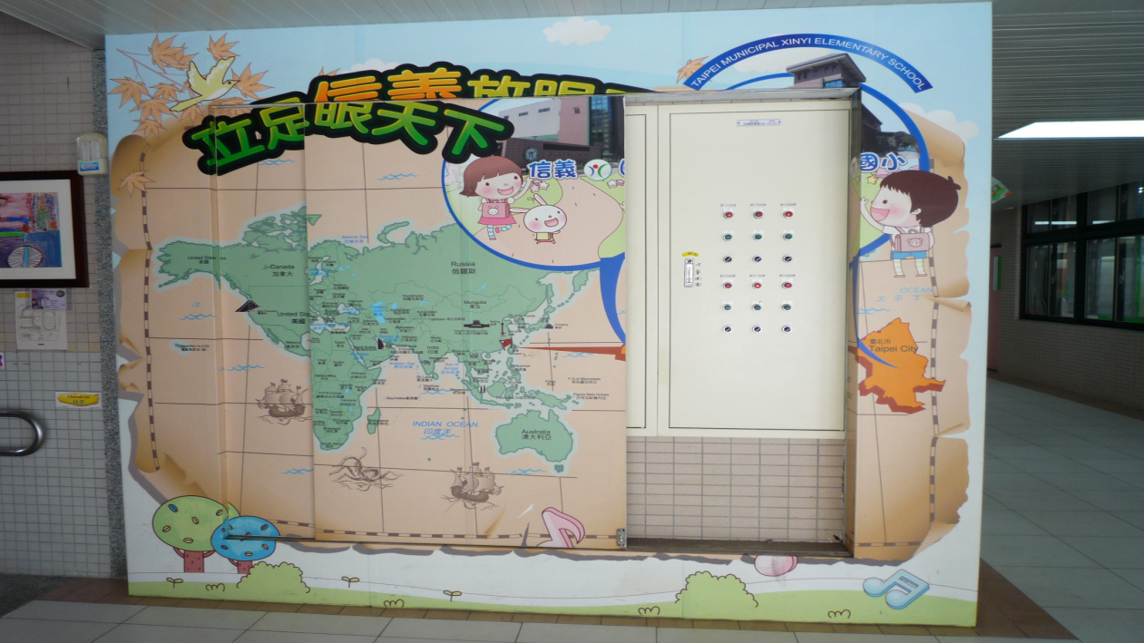 这是信义国小的一个电气箱,我们做了一个教育应用的看板做遮掩,来保持它对安全性的控制。