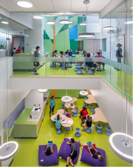 美国乔治亚州某初中的沉浸式学习环境,加上明亮的色彩、自然采光、注意音响和室内空气品质,对学校有帮助,并成为让老师和学生愉悦和舒适的地方。