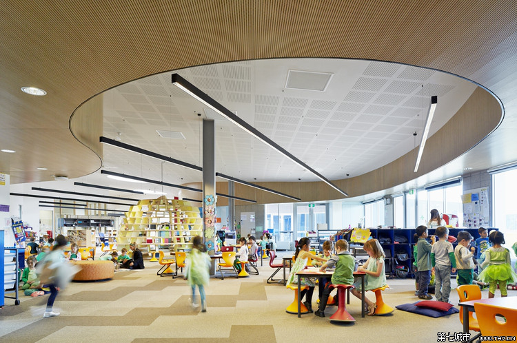 这是澳洲的一所小学,它的空间比较大,容纳250名的学生,空间之间整体透明,将学习者连在一起,创造重要的团体意识。