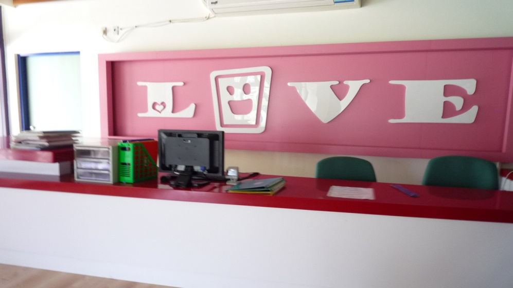 在台中市大墩国小,把“LOVE”用各国文字在中间的绿色墙面上做了公共艺术。