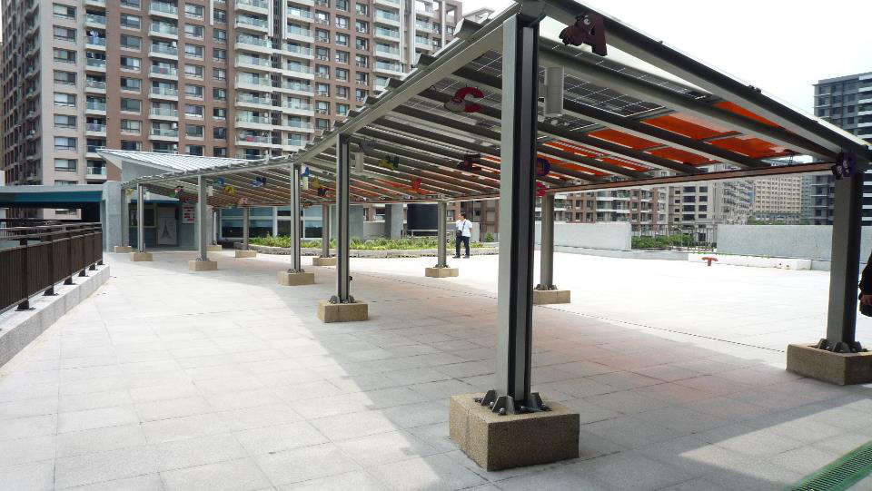 新北市的一个小学,用太阳能板做通道,可以遮阳、遮雨,也可以吸收太阳能。