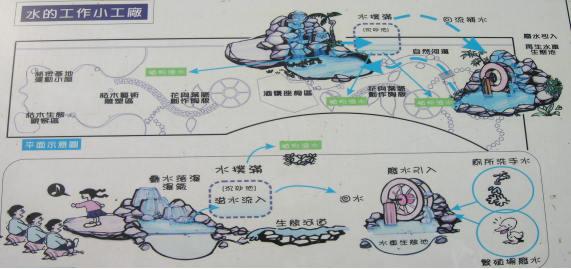 水的应用即如何让水循环,要让水资源形成景观,让它能够消毒、杀菌,然后水再回收,再循环、再利用,这样的一个过程写成一个板子,这个板子的说明再列入环保教育课程,形成一套完整的系统。