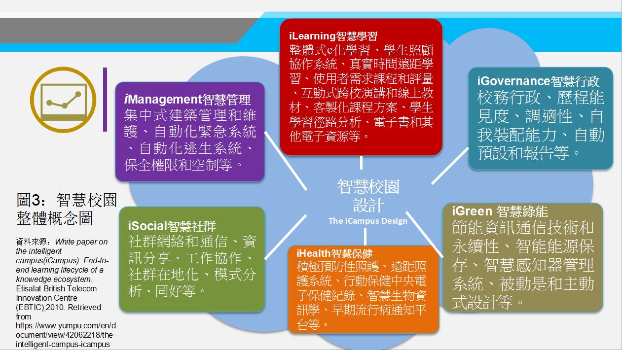 数位科技校园,学校应有完整的智慧校园(iCampus)系统(包括智慧学习、智慧行政、智慧管理、智慧绿能、智慧社交、智慧健康) (汤志民,2015年12月19日)。因应数位化、智慧化、科技化,数位科技校园主要具体做法要举包括: