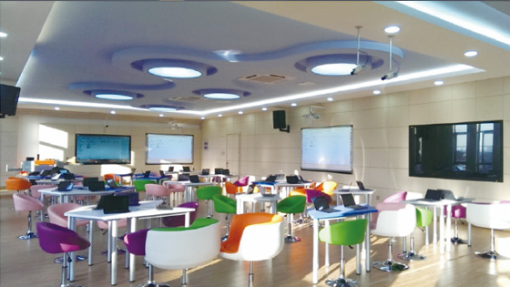 大连金洲新区红星海学校的未来教室(上)和录影中心(下),学生可以在录影中心做一些录像,这个空间提供了很好的应用环境。