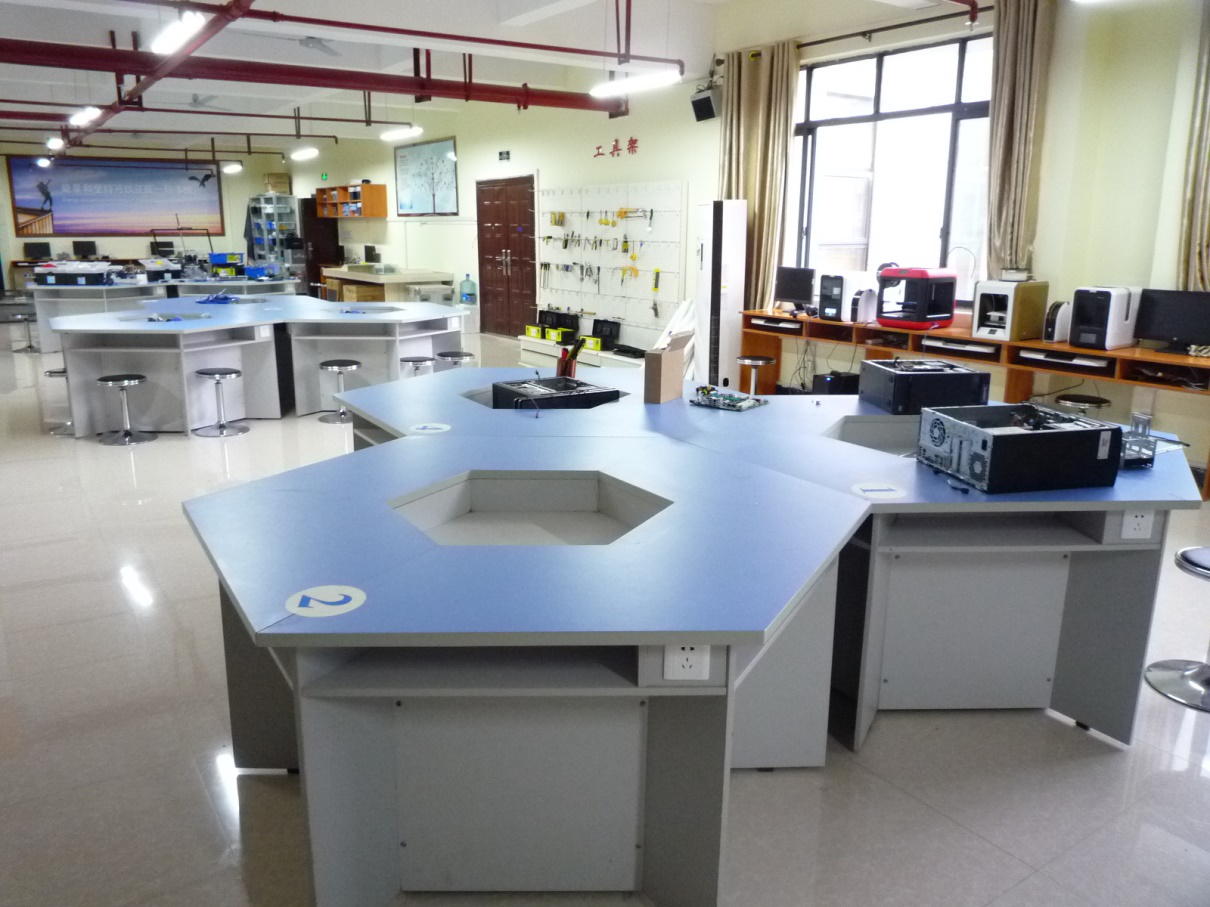 创客教室是介于物理、生物、信息技术教室之间的整合,它的使用包括上课时间,也包括课后社团活动的应用。