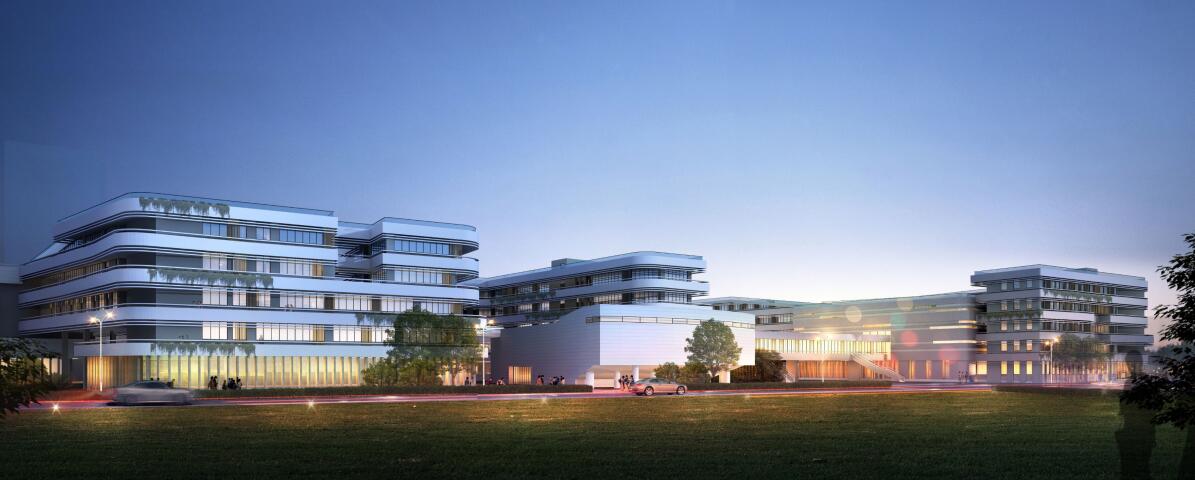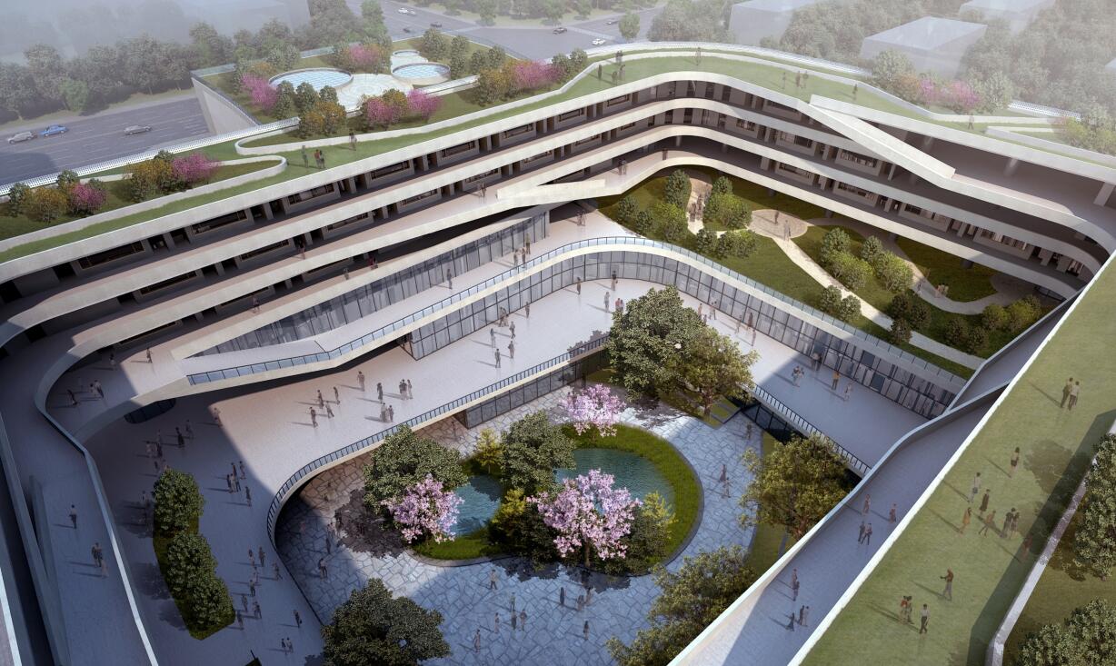 这是鸟瞰图,我们在园林里,中间部分打造了一个书院。从外观来说,整体的建筑还是比较希望做成现代的模式,因为这毕竟是在一个城市新区里。