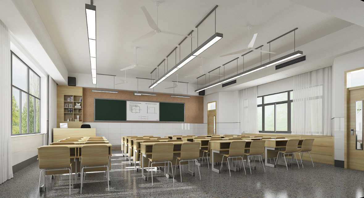 因为这张效果图显示的是宏观的整体,其实在微观上可以看到阳台都有进退关系,教室前面的活动空间都会有不同,而这不同又给学生提供了非常好的交流空间。你站在走廊上可以看到每个面都有一定的微差,我们在视界的处理上做了非常多的考虑。