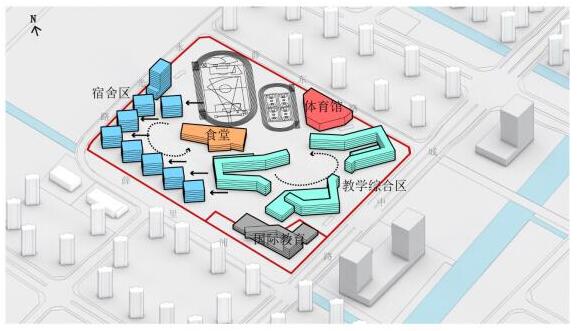 通过将行政综合及实验区前置,使得教学区与主路的噪音源之间有了一定遮挡,避免对教学区的干扰。宿舍区位于最为安静的区域。
